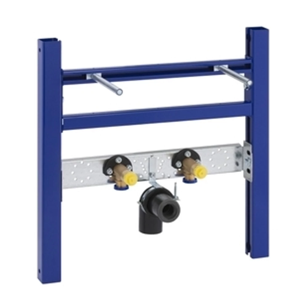 Duofix Basic 111.464.00.1 mosdó szerelőelem álló csapteleppel szerelt fali mosdó részére Teljes belmagasságú könnyűszerkezetes falba Álló csapteleppel szerelt mosdóhoz Tulajdonságok Szerelőkeret porszórt felülettel, ultramarin kék színben Magasságban és mélységben állítható szerelvény csatlakozó lemez Magasságban állítható hangcsillapított lefolyóív rögzítés Szállítási terjedelem 2 db R 1/2" méretű falikorong, 2 db rögzítőprofil, ø 50 mm méretű lefolyóív, ø 44/32 mm szifoncsatlakozó tömítés, 2 db M10-es menetes szár a kerámia rögzítésére, rögzítőanyag
