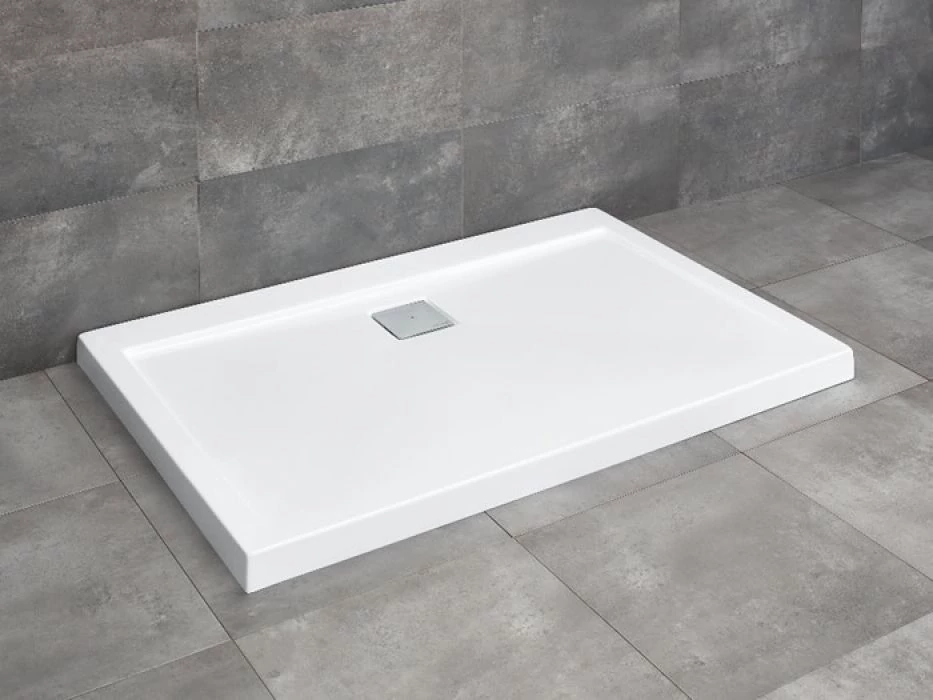 Szögletes, aszimmetrikus, akril zuhanytálca, közvetlenül a padlósíkra építhető.