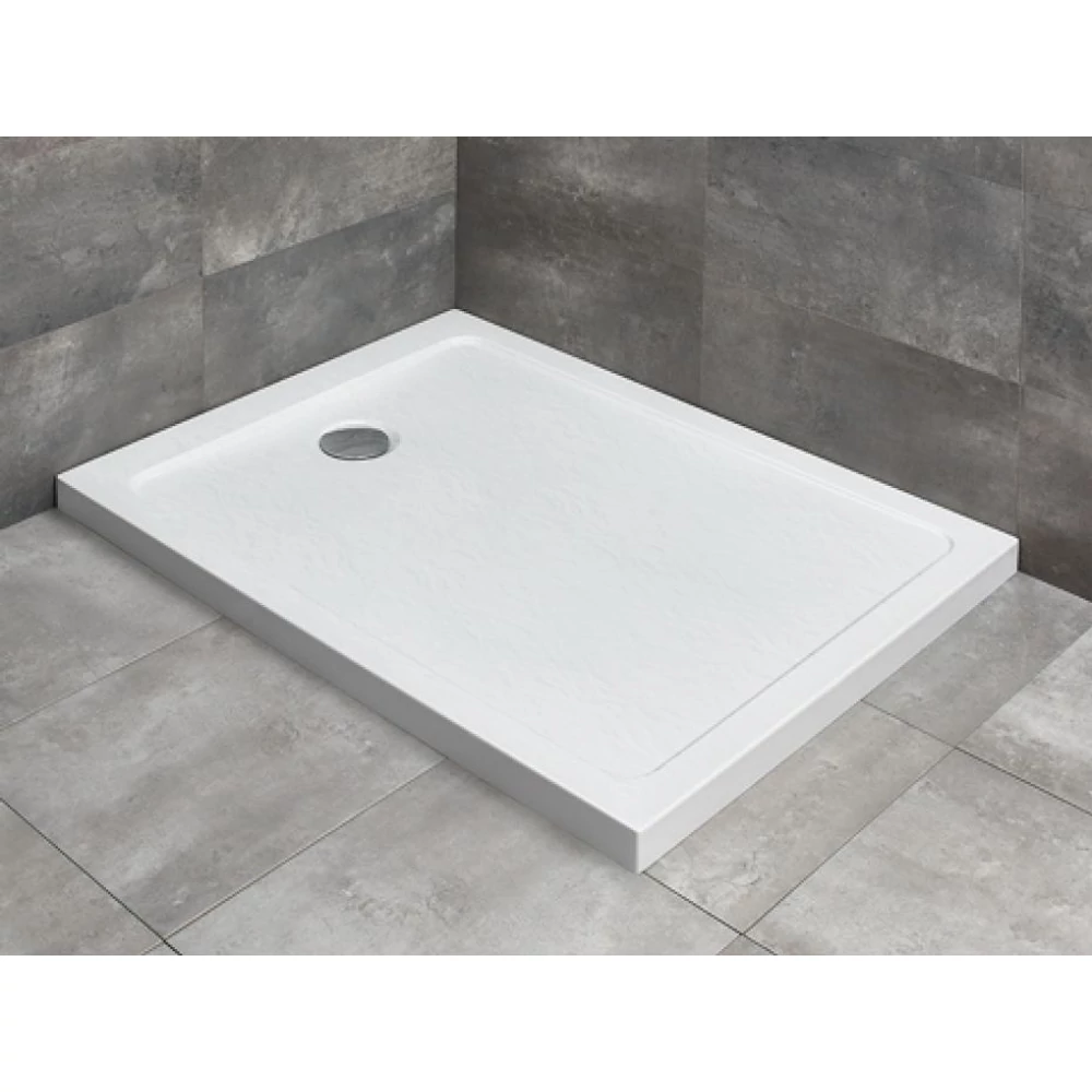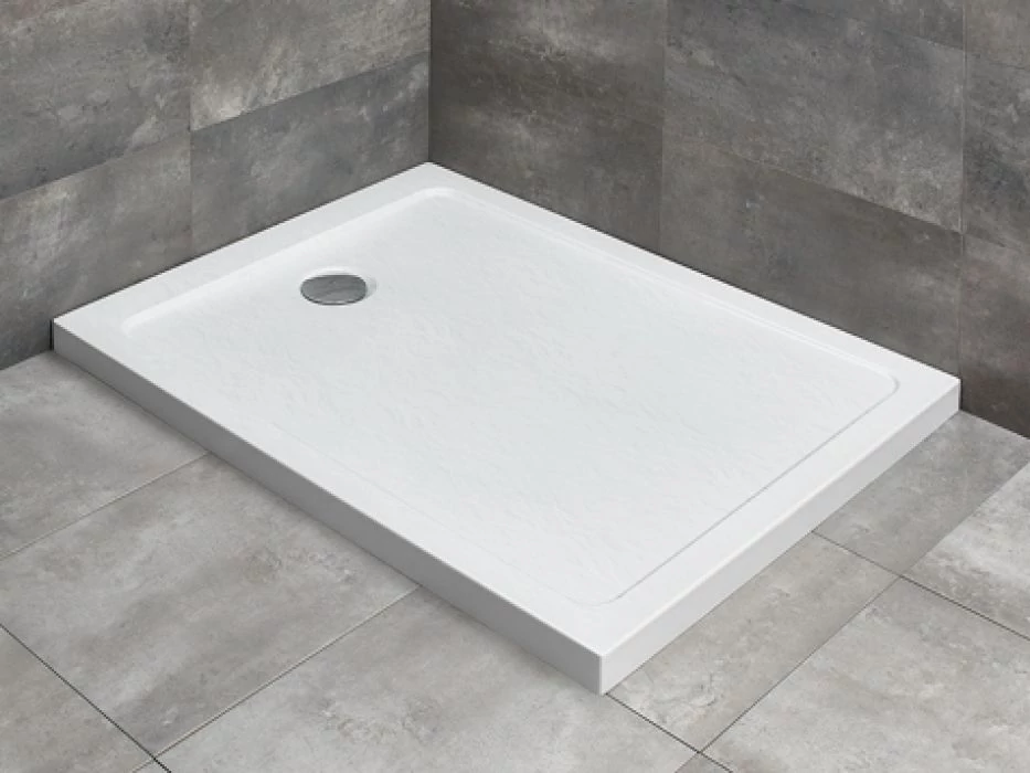 Szögletes aszimmetrikus akril zuhanytálca, közvetlenül a padlósíkra építhető