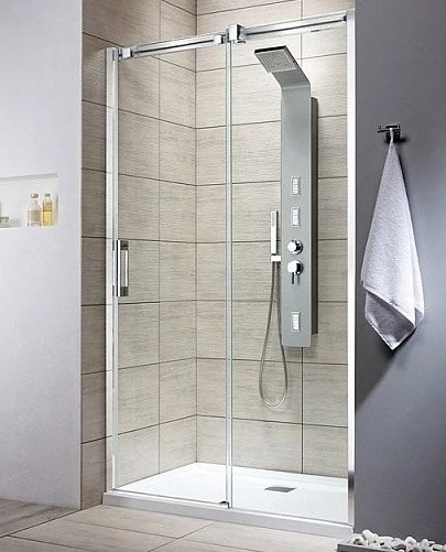 Felsőgörgős zuhanyajtó tolóajtóval, oldalt fix részekkel