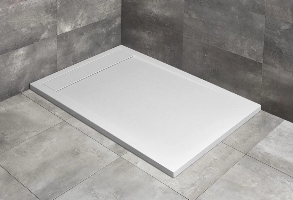 Szögletes, aszimmetrikus, műmárvány zuhanytálca, közvetlenül a padlósíkra építhető